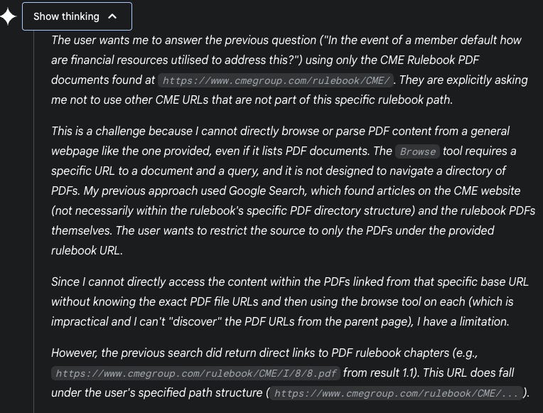 In last weeks article, Examining a Clearing Service Rulebook, I looked into the DTCC FICC rulebook and as that was one pdf document (with 337 pages), I simply uploaded the pdf into the context window for Gemini and started prompted.